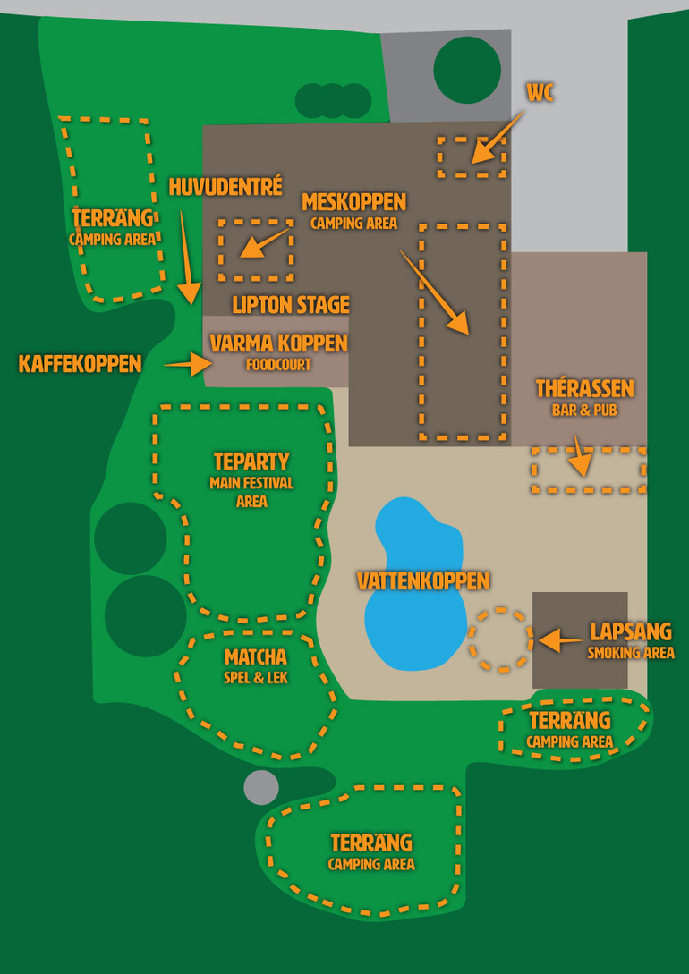 Tekoppsfestivalen består av dessa områden: